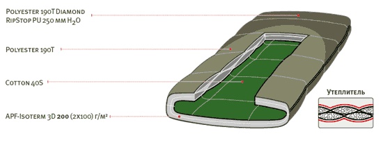 Капюшон, нижняя часть спальника и область ног (более темного цвета) сшита из не продуваемой, влагозащитной и прочной ткани, усиленной плетением RipStop (ткань усилена толстой и прочной нитью в горизонтальном и вертикальном направлении с шагом в два миллиметра). С внешней стороны материал обработан пропиткой WR (water repellent), а с внутренней стороны покрыт слоем полиуретана с водонепроницаемостью 250 мм водяного столба. Центральная часть спальника (светлая ткань) сделана из паропроницаемой ткани, что позволяет спальнику "дышать", выпускать пар и не конденсировать влагу внутри. Утеплитель APF Isoterm 3D представляет собой вспушенное волокно с воздушными каналами и силиконовым покрытием для уменьшения сваливания волокон и предотвращения впитывания влаги. Двухслойный утеплитель сформирован в пакеты, смещенные относительно друг друга на половину ширины пакета, что позволяет значительно сократить потери тепла через швы.