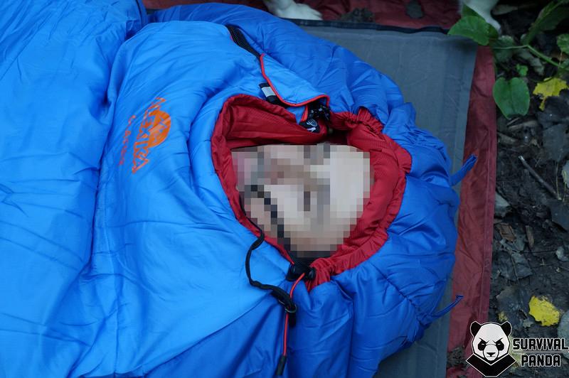 Также валики утеплителя находятся со всех сторон лица. Выполняют они две функции: греют и снижают давление от шнуров утяжки. Кстати, шнуры эти выполнены из разных материалов, что позволяет отличать их на ощупь в темноте. Если продолжать утягивать горловину, то верхний валик сместится на глаза, а нижний, наоборот, откроет рот. Что правильно. Внутрь спальника дышать не надо.